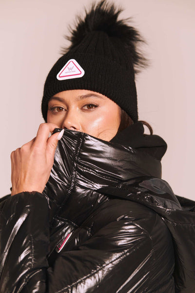 Tamara is styled in the Luxe Noir Crop Down Coat layered over the Noir Ambition Zip-Up Hoodie, paired with the Noir Angora Knit Hat, Noir Waist Shape Leggings, and Noir Bralette. She is wearing a size small and stands at 5’11”, showcasing the coat’s perfect layering capabilities within the Noir Collection.
