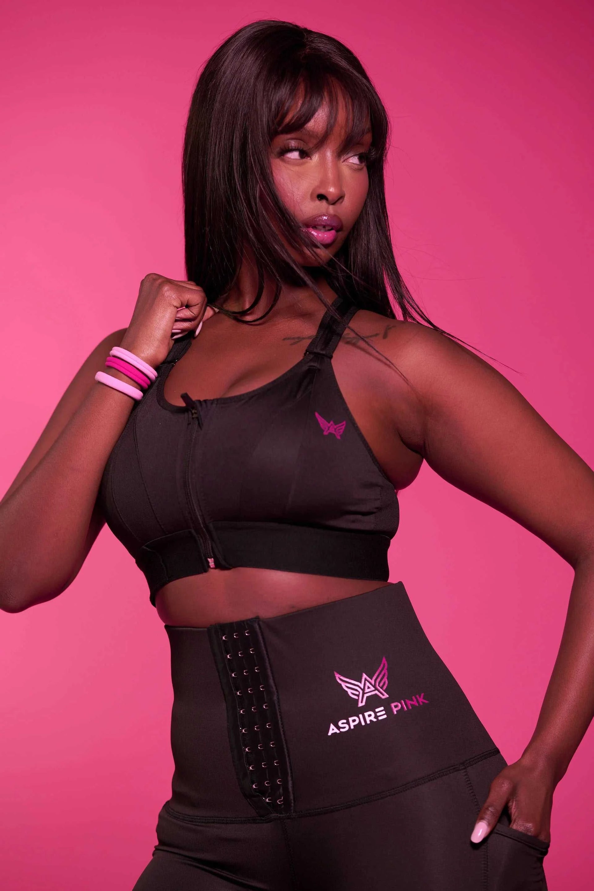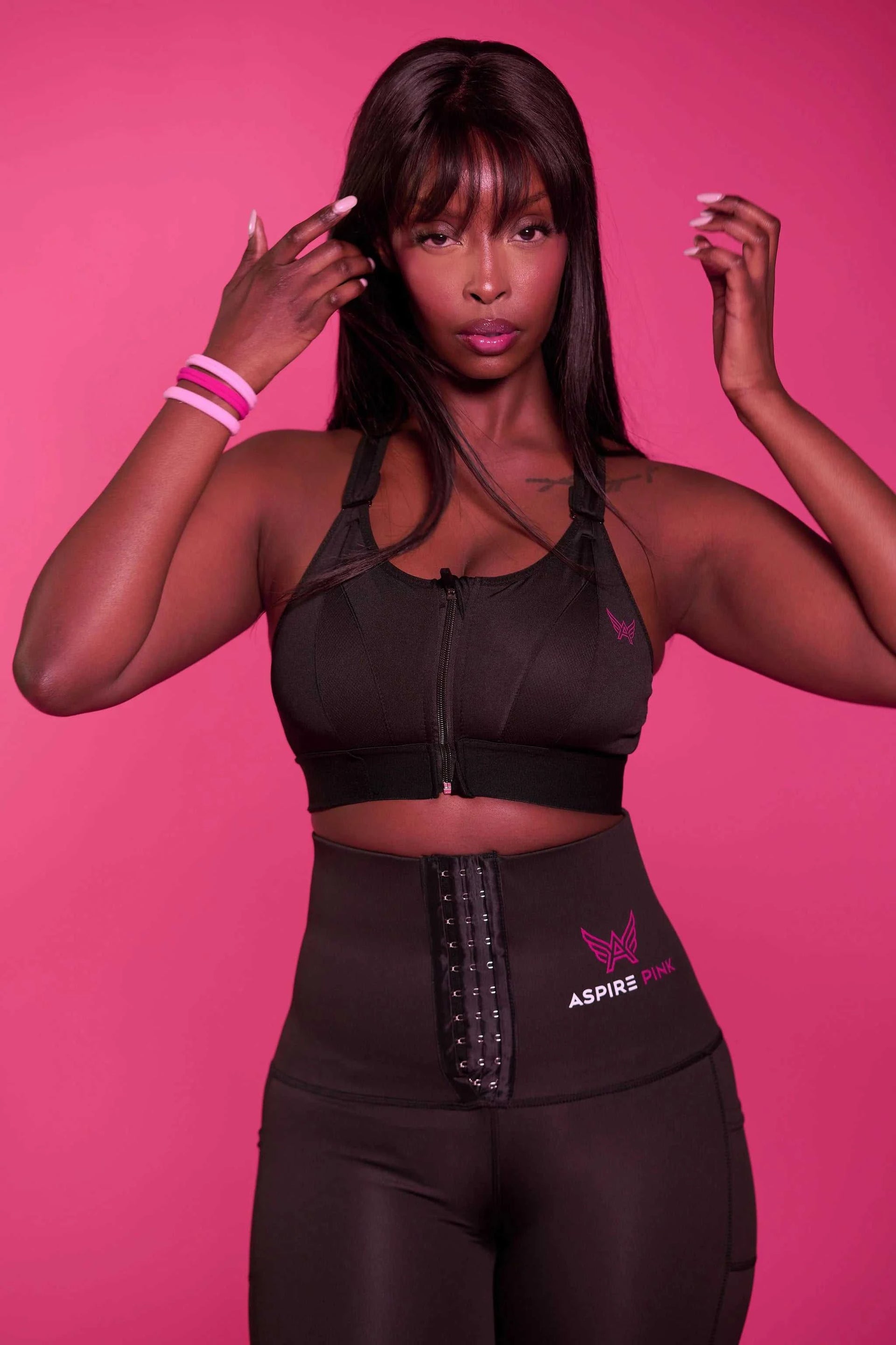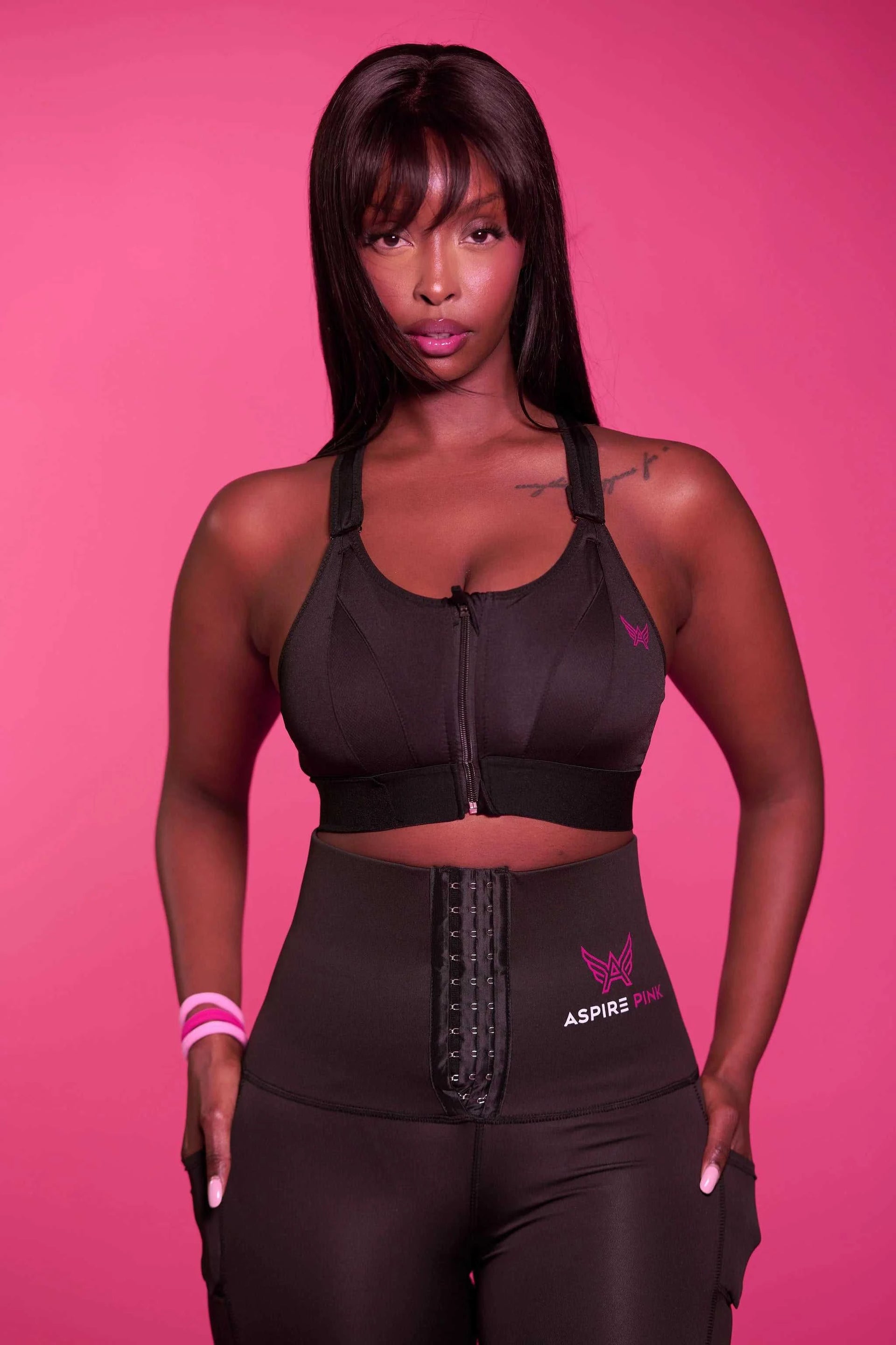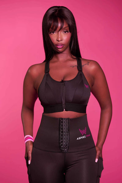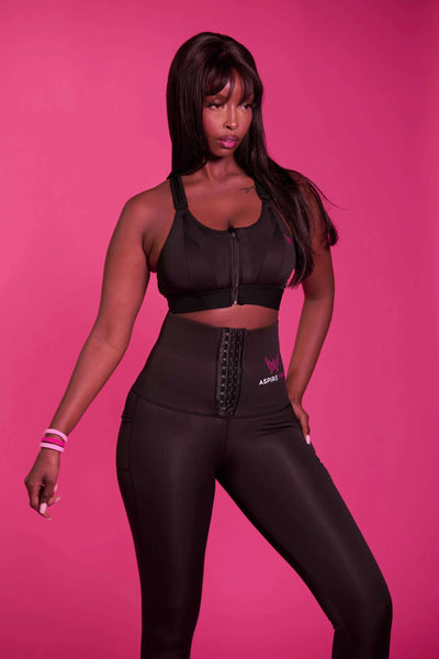 Peace is styled in the Noir Contour Sculpt Sports Bra and Noir Contour Trainer Leggings. She is wearing a size large in both items, with measurements of 36DD bust and 30-inch waist. Standing at 5’11”, Peace showcases the perfect balance of support, comfort, and chic design, ideal for any activity or lounging in style.